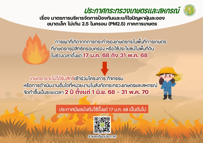 3. ประกาศกระทรวงเกษตรและสหกรณ์ มาตรรการบริหารจัดการและแก้ไขปัญหาฝุ่นละอองขนาดเล็กไม่เกิน 2.5 ไมครอน (PM 2.5) ภาคเกษตร ณ วันที่ 17 มกราคม 2568