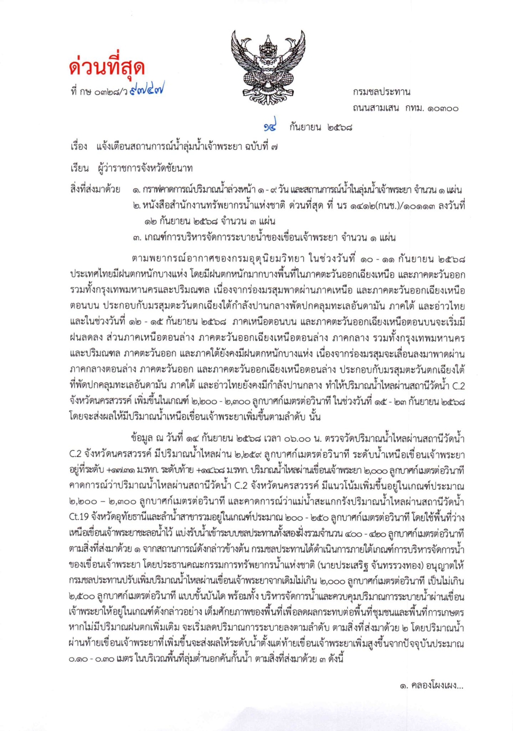 ด่วนที่สุด เรื่อง แจ้งเตือนสถานการณ์น้ำลุ่มน้ำเจ้าพระยา ฉบับที่ 7 กรมชลประทาน