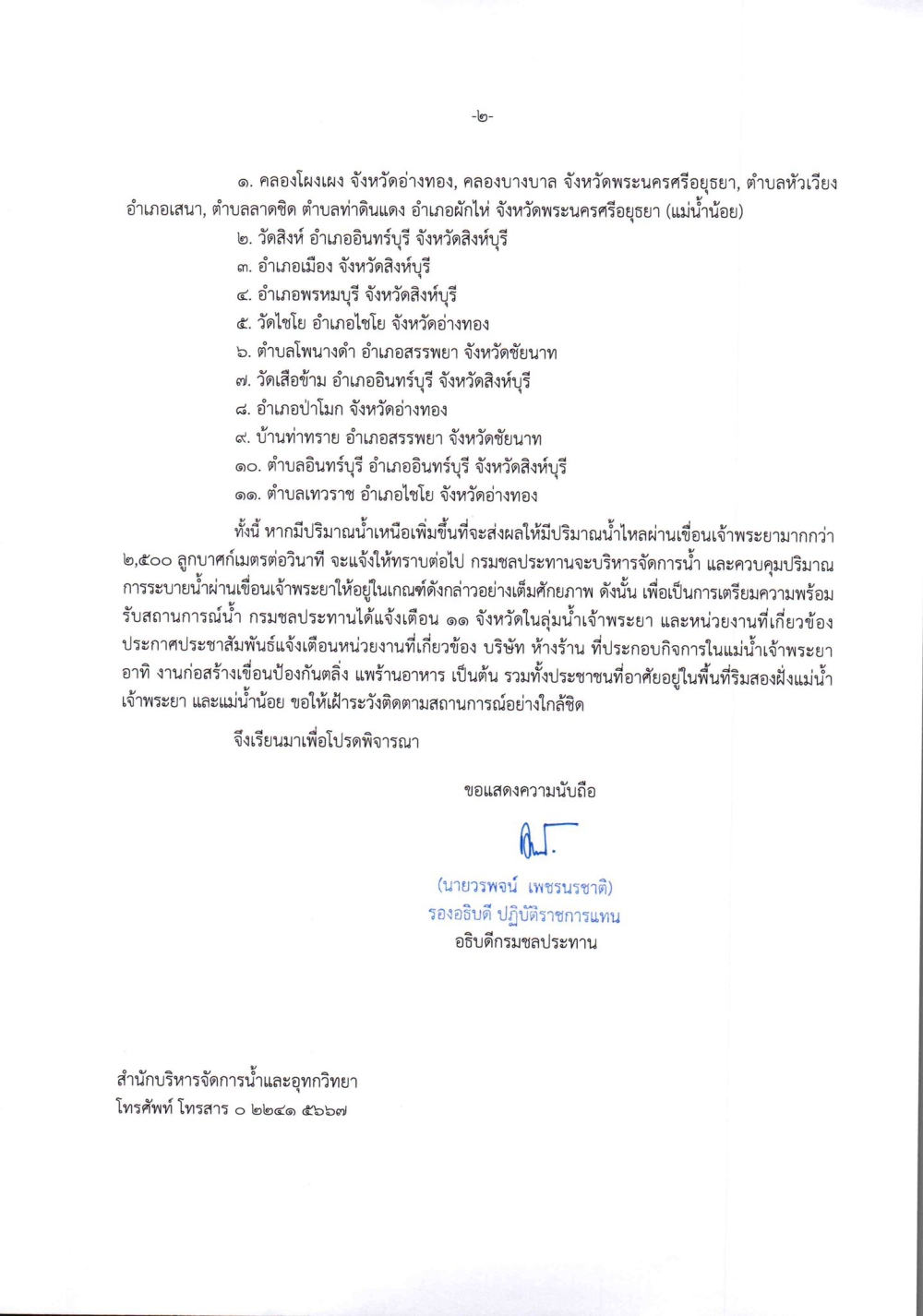 เรื่อง แจ้งเตือนสถานการณ์น้ำลุ่มน้ำเจ้าพระยา ฉบับที่ 7 กรมชลประทาน