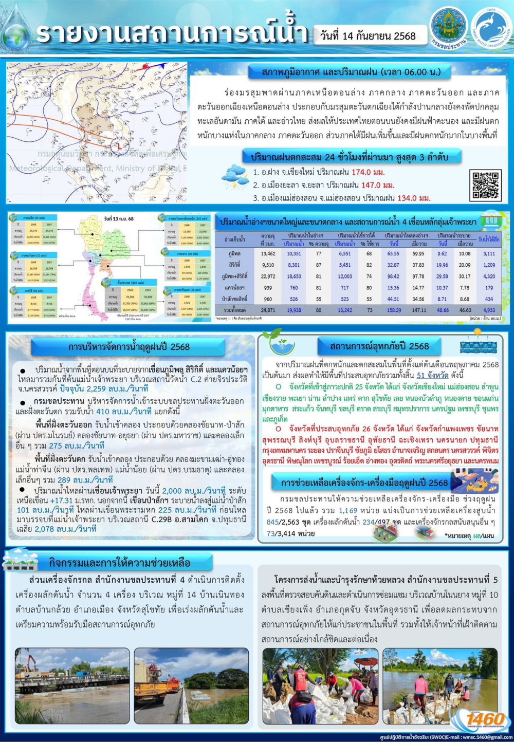 รายงานสถานการณ์น้ำเขื่อนเจ้าพระยา วันที่ 14 กันยายน 2568