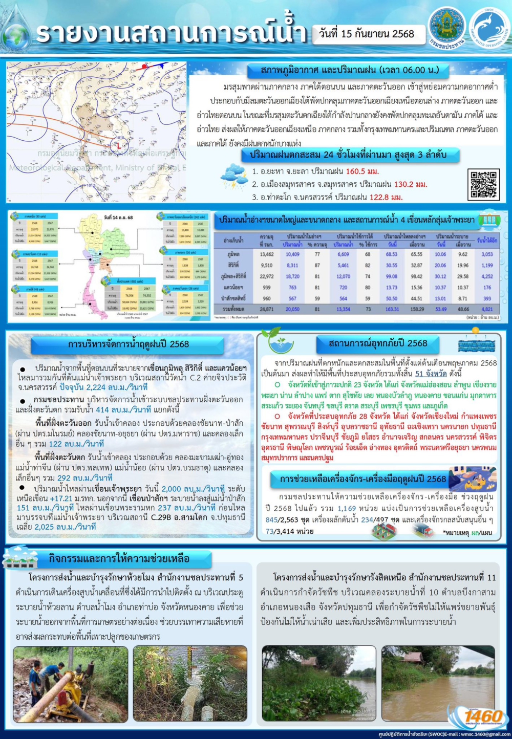 รายงานสถานการณ์น้ำเขื่อนเจ้าพระยา วันที่ 15 กันยายน 2568