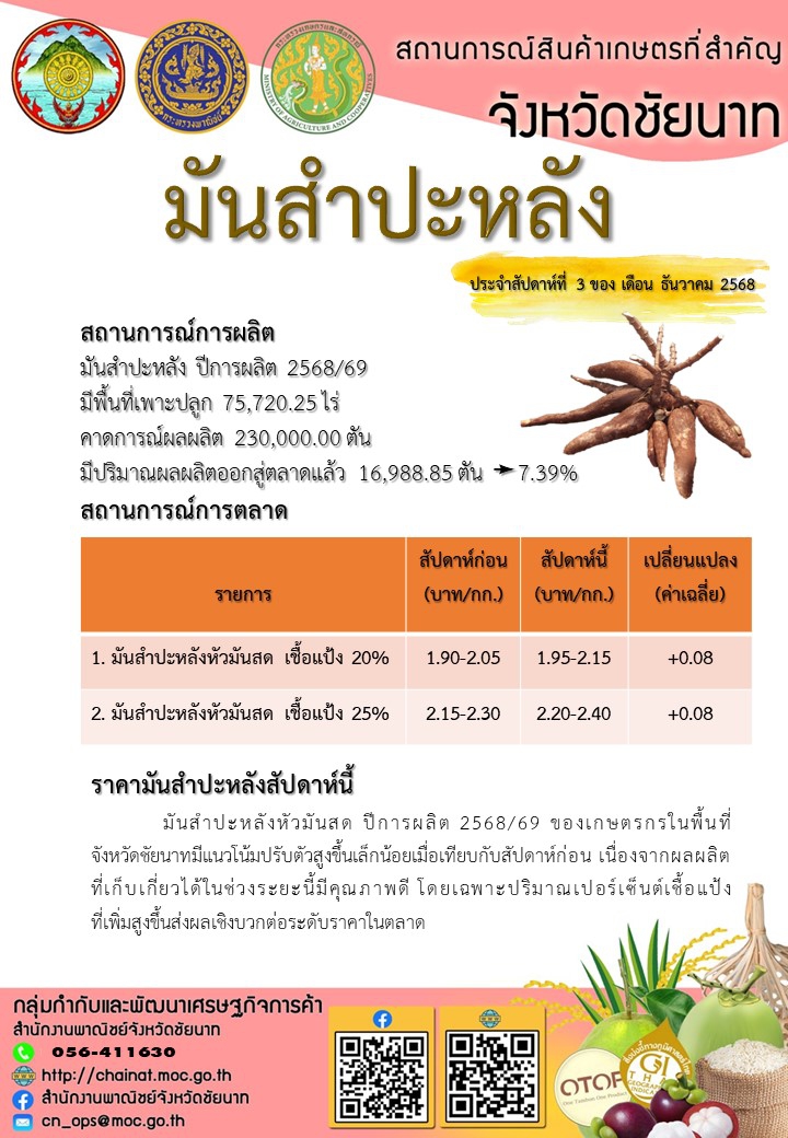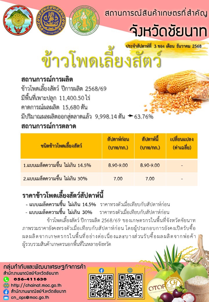 สถานการณ์สินค้าเกษตรที่สำคัญจังหวัดชัยนาท ประจำสัปดาห์ที่ 3 เดือน ธันวาคม 2568 (พณ)