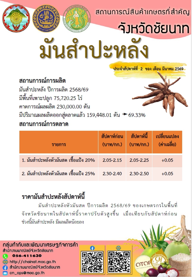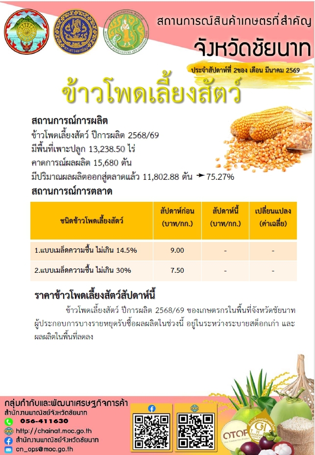 สถานการณ์สินค้าเกษตรที่สำคัญจังหวัดชัยนาท ประจำสัปดาห์ที่ 2 เดือน มีนาคม 2569 (พณ)