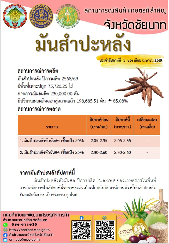 สถานการณ์สินค้าเกษตรที่สำคัญจังหวัดชัยนาท ประจำสัปดาห์ที่ 1 เดือน เมษายน 2569 (พณ)