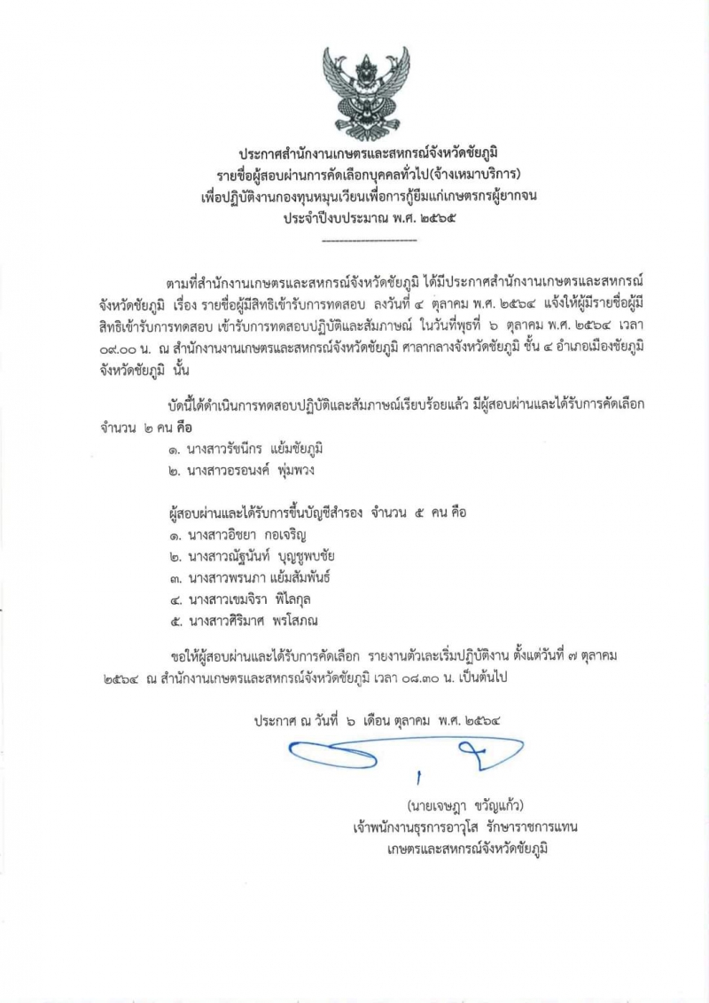 ประกาศสำนักงานเกษตรและสหกรณ์จังหวัดชัยภูมิ รายชื่อผู้สอบผ่านการคัดเลือกบุคคลทั่วไป (จ้างเหมาบริการ) เพื่อปฏิบัติงานกองทุนหมุนเวียนเพื่อการกู้ยืมแก่เกษตรกรผู้ยากจนประจำปีงบประมาณ พ.ศ. 2565