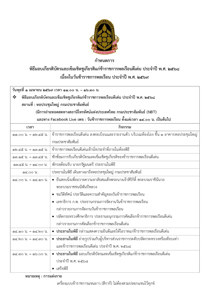 พิธีมอบเกียรติบัตรและเข็มเชิดชูเกียรติแก่ข้าราชการพลเรือนดีเด่น ประจำปี พ.ศ. 2568 และเชิญชมนิทรรศการออนไลน์ วันข้าราชการพลเรือน ประจำปี 2569