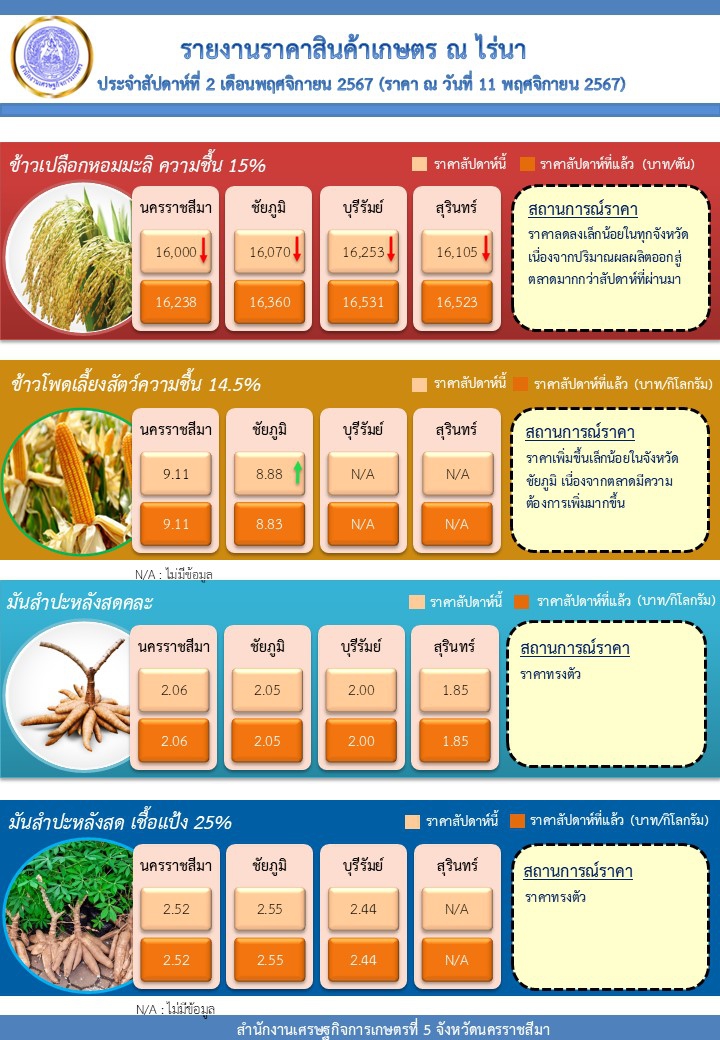 รายงานราคาสินค้าเกษตร ณ ไร่นา ประจำสัปดาห์ที่ 2 เดือนพฤศจิกายน 2567 (ราคา ณ วันที่ 11 พฤศจิกายน 2567)
