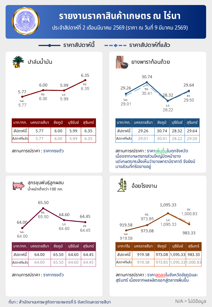 รายงานราคาสินค้าเกษตร ณ ไร่นา ประจำสัปดาห์ที่ 2 เดือนมีนาคม 2569 (ราคา ณ วันที่ 9 มีนาคม 2569)