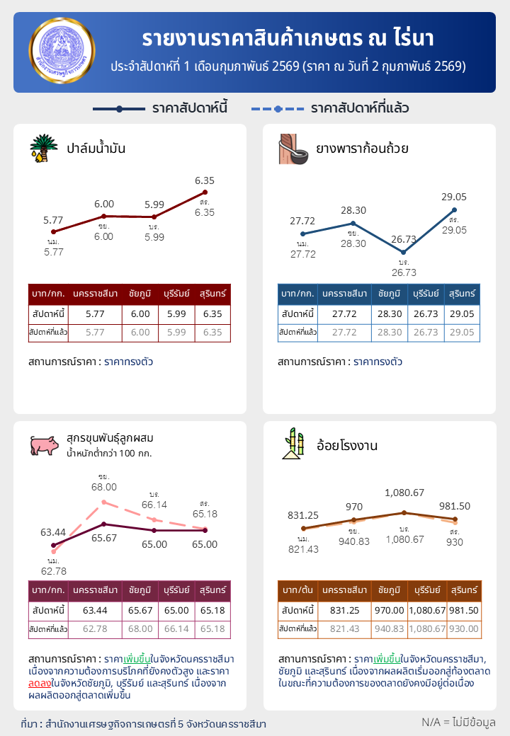 รายงานราคาสินค้าเกษตร ณ ไร่นา ประจำสัปดาห์ที่ 1 เดือนกุมภาพันธ์ 2569 (ราคา ณ วันที่ 2 กุมภาพันธ์ 2569)