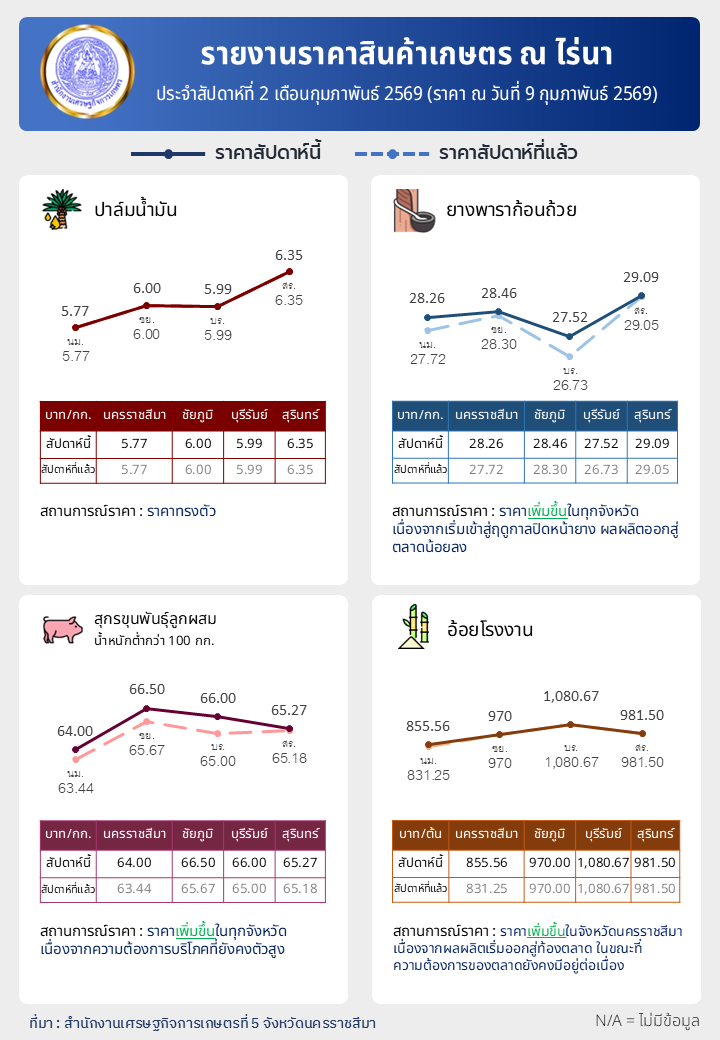 รายงานราคาสินค้าเกษตร ณ ไร่นา ประจำสัปดาห์ที่ 2 เดือนกุมภาพันธ์ 2569 (ราคา ณ วันที่ 9 กุมภาพันธ์ 2569)