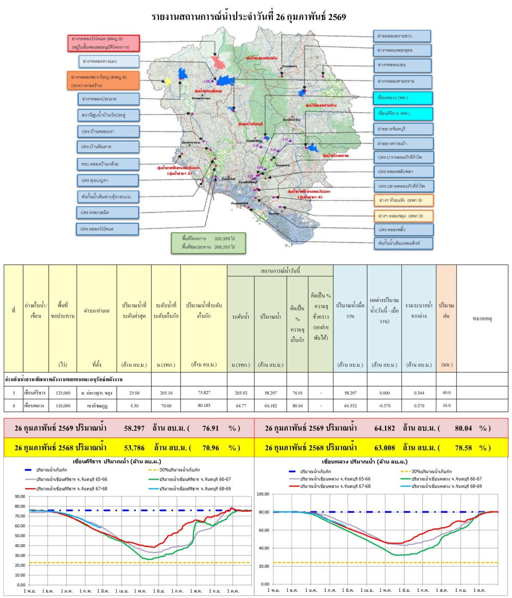 รายงานปริมาณน้ำฝนจังหวัดจันทบุรี/สถานการณ์น้ำ ประจำวันที่ 26 กุมภาพันธ์ 2569