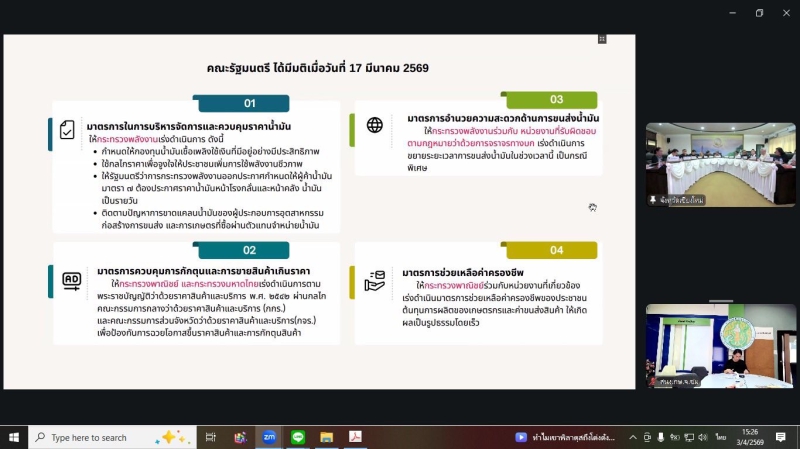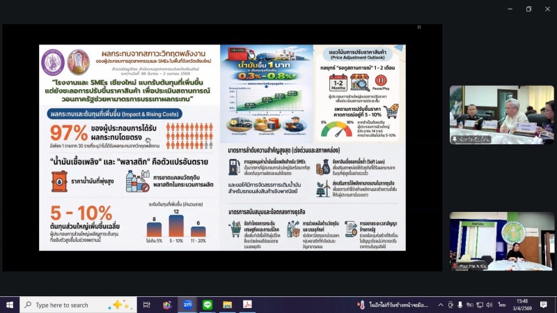 วันศุกร์ที่ 3 เมษายน 2569 เวลา 15.00 น นางจีระนันท์ สว่างดวง เกษตรและสหกรณ์จังหวัดเชียงใหม่ เข้าร่วมประชุมคณะกรรมการอำนวยการศูนย์บริหารและติดตามสถานการณ์เพื่อบริหารจัดการผลกระทบจากสถานการณ์สู้รบในตะวันออกกลาง ณ ห้องประชุม POC ศาลากลางจังหวัดเชียงใหม่ โดยมีนายรัฐพล นราดิศร ผู้ว่าราชการจังหวัดเชียงใหม่ เป็นประธานการประชุม พร้อมด้วย นายบุญลือ ธรรมธรานุรักษ์ และนายศิวกร บัวป้อง รองผู้ว่าราชการจังหวัดเชียงใหม่ หัวหน้าส่วนราชการและเจ้าหน้าที่ที่เกี่ยวข้องเข้าร่วมประชุมโดยพร้อมเพรียงกัน ที่ประชุมได้ติดตามสถานการณ์เพื่อบริหารจัดการผลกระทบจากสถานการณ์สู้รบในตะวันออกกลาง 7 ด้าน และประเมินผลกระทบในพื้นที่ื ตลอดจนร่วมกันกำหนดแนวทางแก้ไขและบรรเทาผลกระทบในทุกมิติ หากประเด็นใดเกินขีดความสามารถของจังหวัด จะเสนอให้ส่วนกลางพิจารณาให้ความช่วยเหลือต่อไป ทั้งนี้ เกษตรและสหกรณ์จังหวัดเชียงใหม่ ได้รับมอบหมายให้เป็นหัวหน้าคณะทำงานด้านความมั่นคงอาหาร ได้นำเสนอข้อมูลด้านการเกษตรจังหวัดเชียงใหม่ซึ่งปัจจุบันไม่ได้รับผลกระทบจากการขาดแคลนน้ำมัน แต่ได้รับผลกระทบจากต้นทุนที่เพิ่มสูงขึ้น โดยจังหวัดได้มอบหมายให้หน่วยงานที่เกี่ยวข้องสำรวจความต้องการใช้น้ำมันล่วงหน้า และวางแผนบริหารจัดการให้เพียงพอ รวมถึงส่งเสริมให้เกษตรกรปรับตัวตามแนวทางเศรษฐกิจพอเพียงเพื่อลดผลกระทบ ในการนี้ จังหวัดเชียงใหม่ยังคงติดตามสถานการณ์อย่างใกล้ชิด พร้อมบูรณาการความร่วมมือจากทุกภาคส่วน เพื่อดูแลผลกระทบที่เกิดขึ้นกับประชาชนให้ครอบคลุมและมีประสิทธิภาพสูงสุด