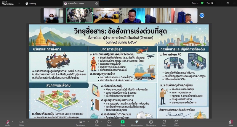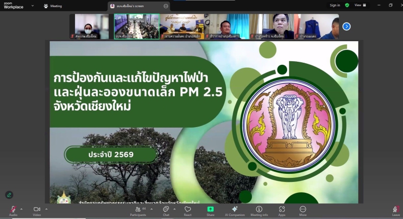 วันจันทร์ที่ 30 มีนาคม 2569 นายสุชาติ ชมกลิ่น รองนายกรัฐมนตรี และรัฐมนตรีว่าการกระทรวงทรัพยากรธรรมชาติและสิ่งแวดล้อม เป็นประธานประชุมติดตามสถานการณ์ไฟป่าในพื้นที่จังหวัดเชียงใหม่ โดยมี นายรัฐพล นราดิศร ผู้ว่าราชการจังหวัดเชียงใหม่ และนายพิชัย เลิศพงษ์อดิศร นายกองค์การบริหารส่วนจังหวัดเชียงใหม่ และหน่วยงานที่เกี่ยวข้องเข้าร่วมประชุม ณ ห้องปฏิบัติการศูนย์บัญชาการเหตุการณ์ไฟป่า หมอกควัน และฝุ่นละออง จังหวัดเชียงใหม่ ในการนี้ นางจีระนันท์ สว่างดวง เกษตรและสหกรณ์จังหวัดเชียงใหม่ มอบหมายให้นางสาวกาญจนา วงค์กาด นักวิเคราะห์นโยบายและแผนชำนาญการ กลุ่มช่วยเหลือเกษตรกรและโครงการพิเศษ เข้าร่วมประชุมฯ ผ่านระบบประชุมออนไลน์ Zoom Meeting ในครั้งนี้