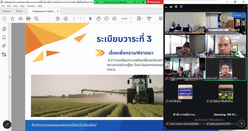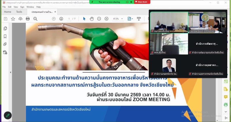วันจันทร์ที่ 30 มีนาคม 2569 เวลา 14.00 น. นางจีระนันท์ สว่างดวง เกษตรและสหกรณ์จังหวัดเชียงใหม่ หัวหน้าคณะทำงานด้านความมั่นคงทางอาหาร ศูนย์บริหารและติดตามสถานการณ์เพื่อบริหารจัดการผลกระทบจากสถานการณ์การสู้รบในตะวันออกกลาง จังหวัดเชียงใหม่ (ศบก.จ.ชม.) เป็นประธานการประชุมคณะทำงานด้านความมั่นคงทางอาหารเพื่อบริหารจัดการผลกระทบจากสถานการณ์การสู้รบในตะวันออกกลาง จังหวัดเชียงใหม่ ณ ห้องประชุมสำนักงานเกษตรและสหกรณ์จังหวัดเชียงใหม่ ผ่านระบบประชุมออนไลน์ Zoom Meeting โดยมี หัวหน้าส่วนราชการ ผู้แทนหน่วยงานที่เกี่ยวข้อง และเจ้าหน้าที่สำนักงานเกษตรและสหกรณ์จังหวัดเชียงใหม่ เข้าร่วมประชุม
