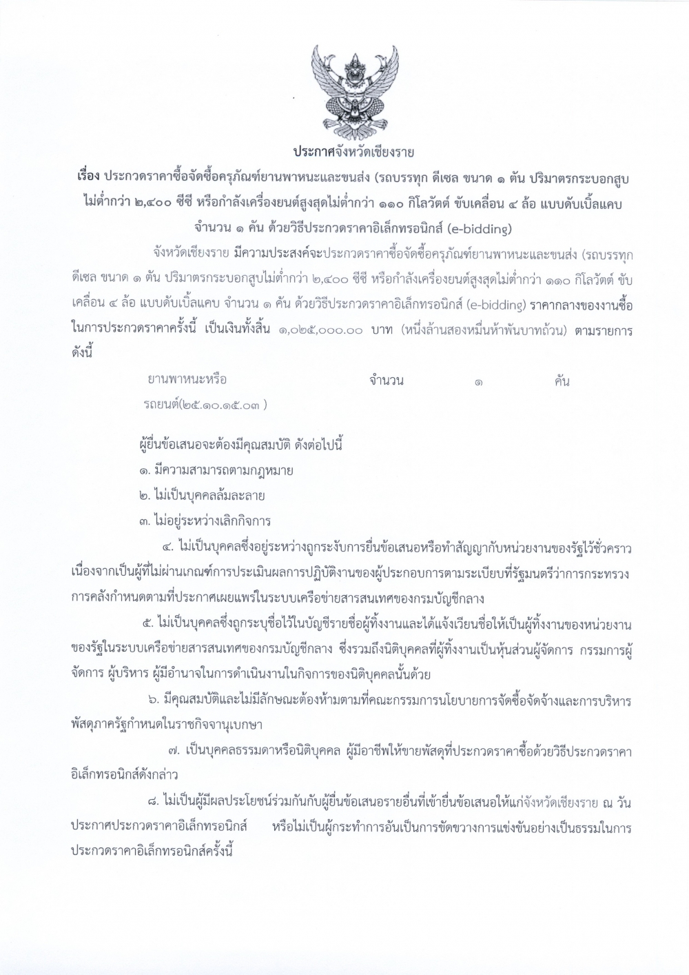 ประกาศจังหวัดเชียงราย เรื่อง ประกวดราคาซื้อจัดซื้อครุภัณฑ์ยานพาหนะและขนส่ง