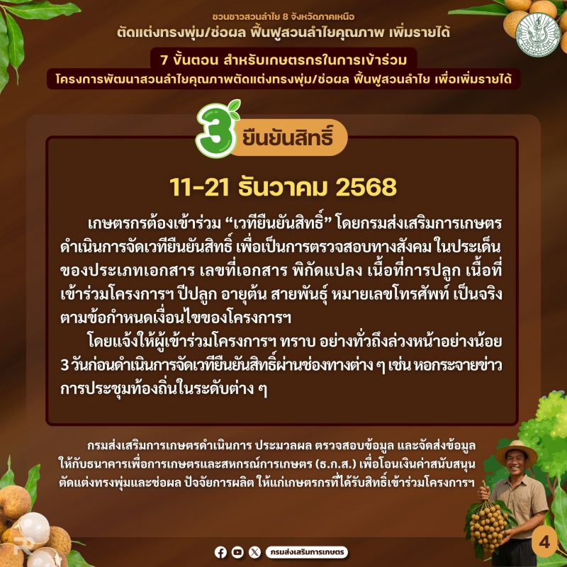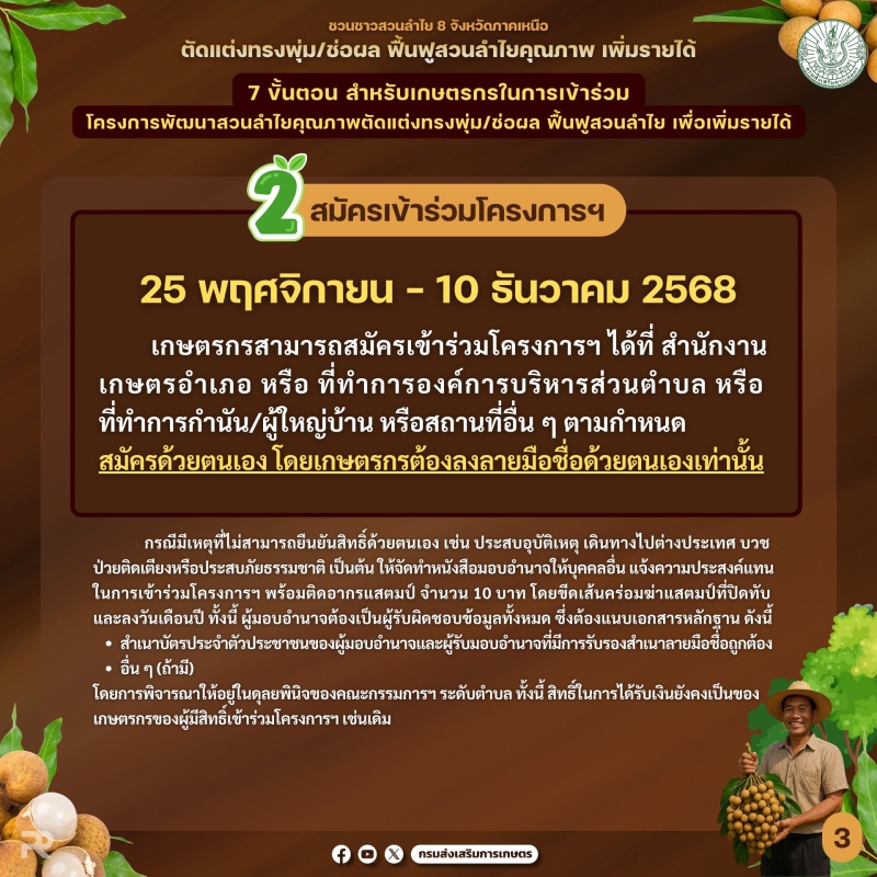 เริ่มตรวจสอบรายชื่อเกษตรกรที่มีสิทธิ์เข้าร่วมโครงการฯ ณ สำนักงานเกษตรอำเภอที่ตั้งแปลงปลูก โดยรายชื่อที่ปิดประกาศ จะเป็นรายชื่อที่ขึ้นและปรับปรุงทะเบียนเกษตรกรแล้วในปี 2568 ทั้งนี้ หากไม่ปรากฎชื่อให้ดำเนินการขึ้นหรือปรับปรุงทะเบียนเกษตรกร ให้เป็นปัจจุบัน ภายใน 10 ธันวาคม 2568