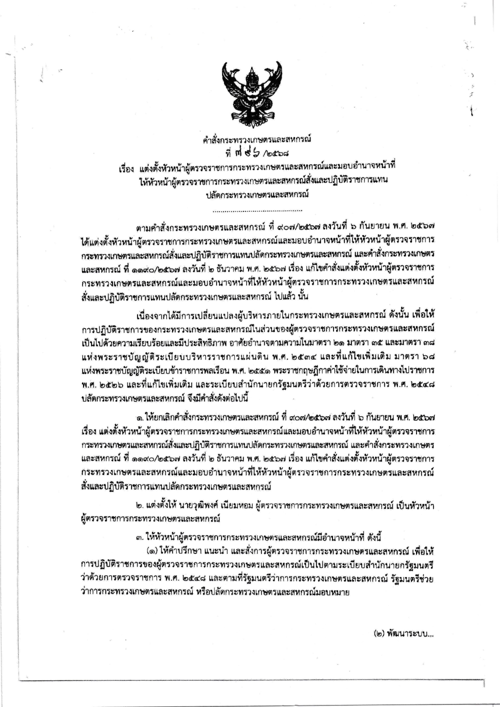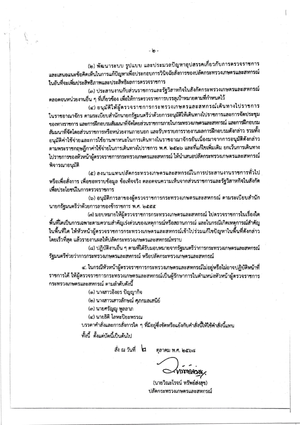 คำสั่งกระทรวงเกษตรและสหกรณ์ ที่ 796/2568 ลงวันที่ 2 ตุลาคม 2568 เรื่อง แต่งตั้งหัวหน้าผู้ตรวจราชการกระทรวงเกษตรและสหกรณ์และมอบอำนาจให้หัวหน้าผู้ตรวจราชการกระทรวงเกษตรและสหกรณ์สั่งและปฏิบัติราชการแทนปลัดกระทรวงเกษตรและสหกรณ์