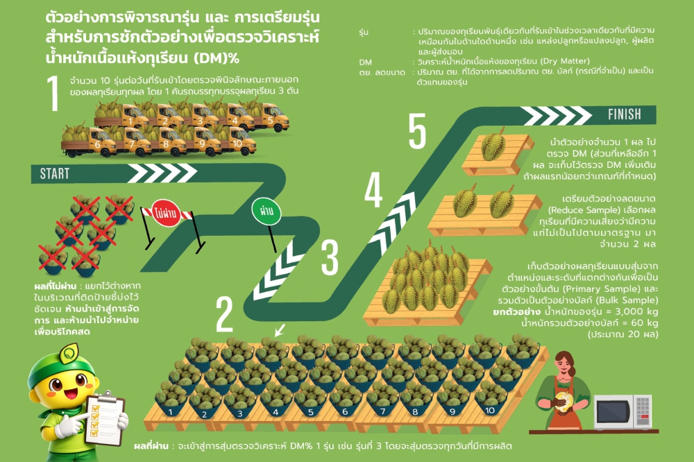 ยกระดับคุณภาพทุเรียนไทย สร้างความเชื่อมั่นสู่ตลาดโลกหลักปฏิบัติในการตรวจและรับผลทุเรียนสำหรับโรงรวบรวมและโรงคัดบรรจุ (มกษ. 9070-2566)มุ่งเน้นการควบคุมคุณภาพตั้งแต่ต้นทางถึงปลายทาง เพื่อผู้บริโภคมั่นใจ เกษตรกรเติบโต และส่งออกอย่างยั่งยืน
