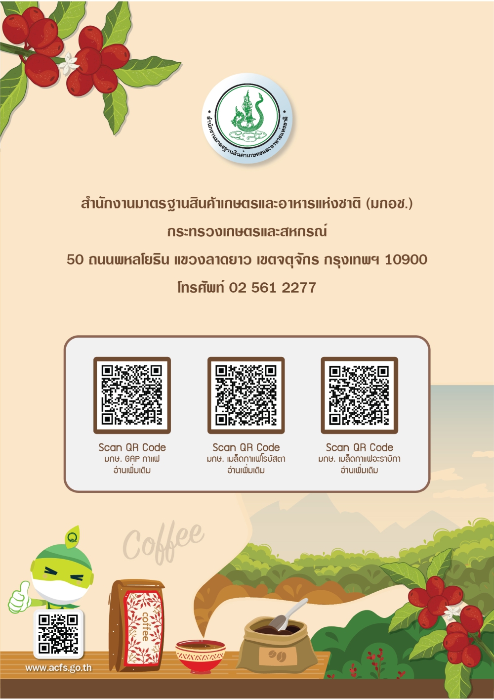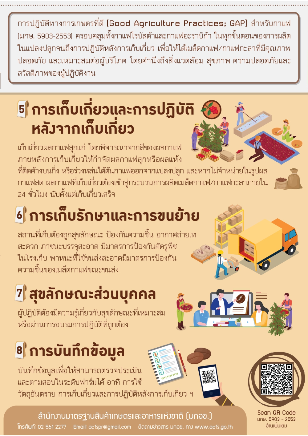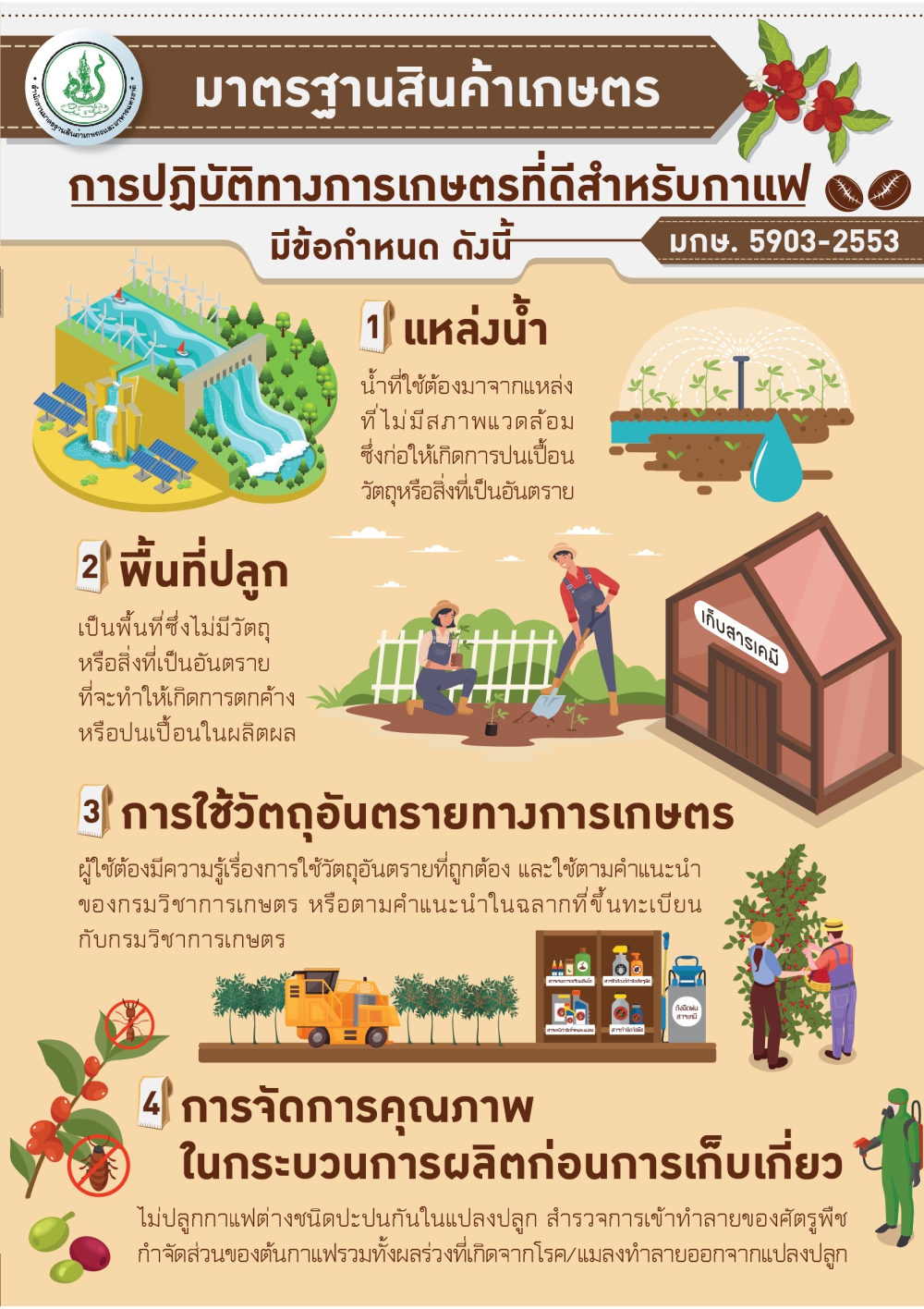 มาตรฐานสินค้าเกษตร เรื่อง การปฏิบัติทางการเกษตรที่ดี (Good Agriculture Practices; GAP) สำหรับกาแฟ (มกษ. 5903-2553) ครอบคลุมทั้งกาแฟโรบัสต้าและกาแฟอะราบิก้า ในทุกขั้นตอนของการผลิตในแปลงปลูกจนถึงการปฏิบัติหลังการเก็บเกี่ยว เพื่อให้ได้เมล็ดกาแฟ/กาแฟกะลาที่มีคุณภาพ ปลอดภัย และเหมาะสมต่อผู้บริโภค โดยคำนึงถึงสิ่งแวดล้อม สุขภาพความปลอดภัยและสวัสดิภาพของผู้ปฏิบัติงาน