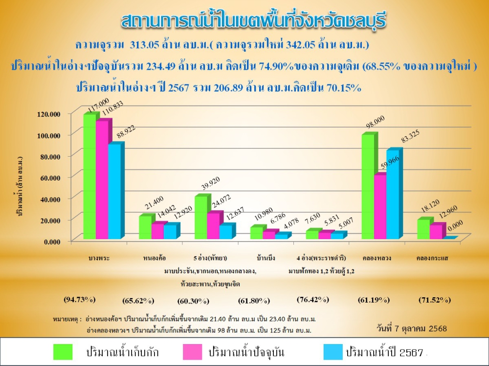 รายงานสถานการณ์น้ำอ่างเก็บน้ำจังหวัดชลบุรี ประจำวันที่ 7 ตุลาคม 2568