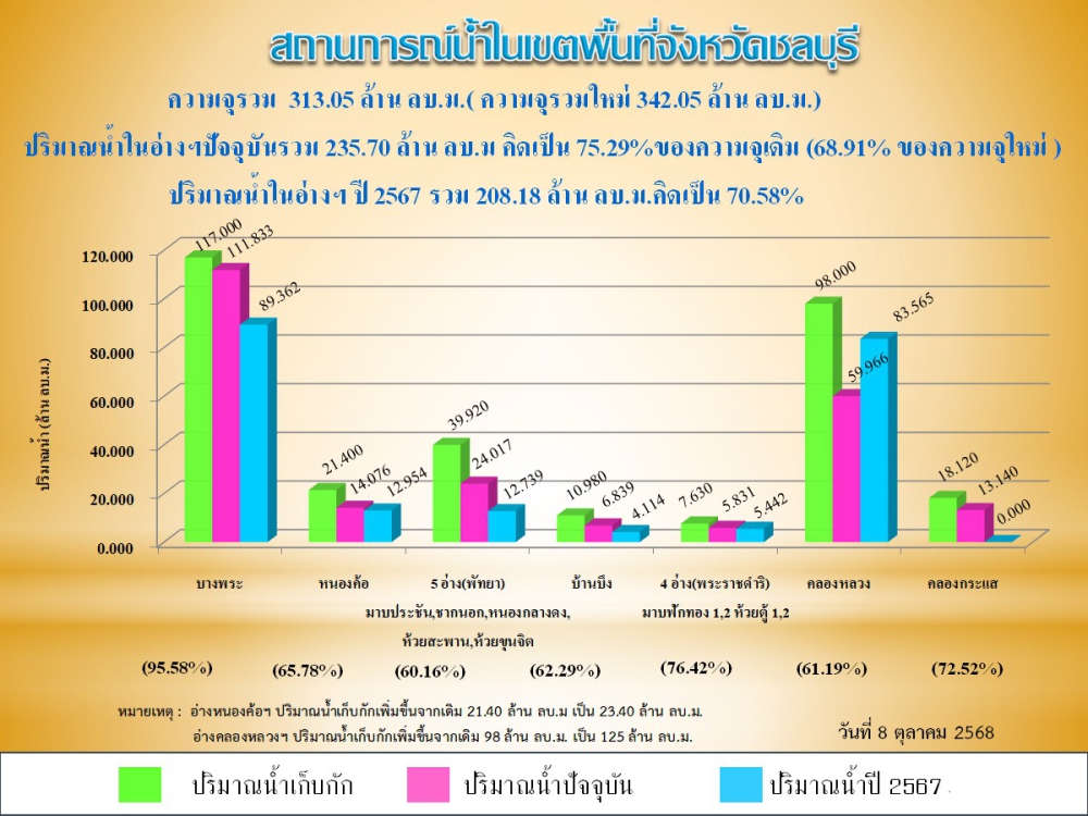 รายงานสถานการณ์น้ำอ่างเก็บน้ำจังหวัดชลบุรี ประจำวันที่ 8 ตุลาคม 2568