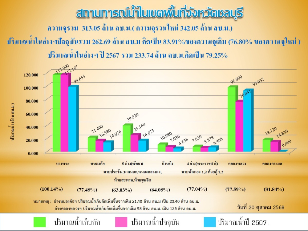รายงานสถานการณ์น้ำอ่างเก็บน้ำจังหวัดชลบุรี ประจำวันที่ 20 ตุลาคม 2568