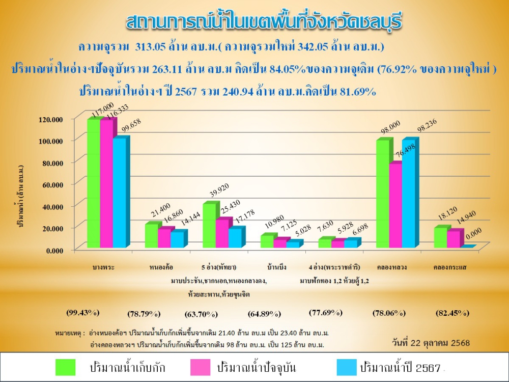 รายงานสถานการณ์น้ำอ่างเก็บน้ำจังหวัดชลบุรี ประจำวันที่ 22 ตุลาคม 2568