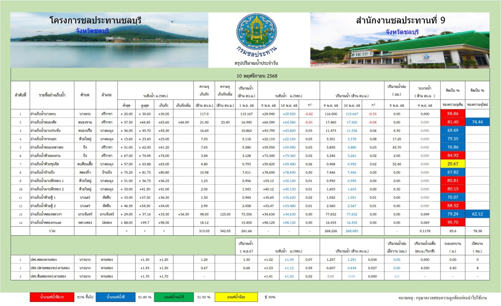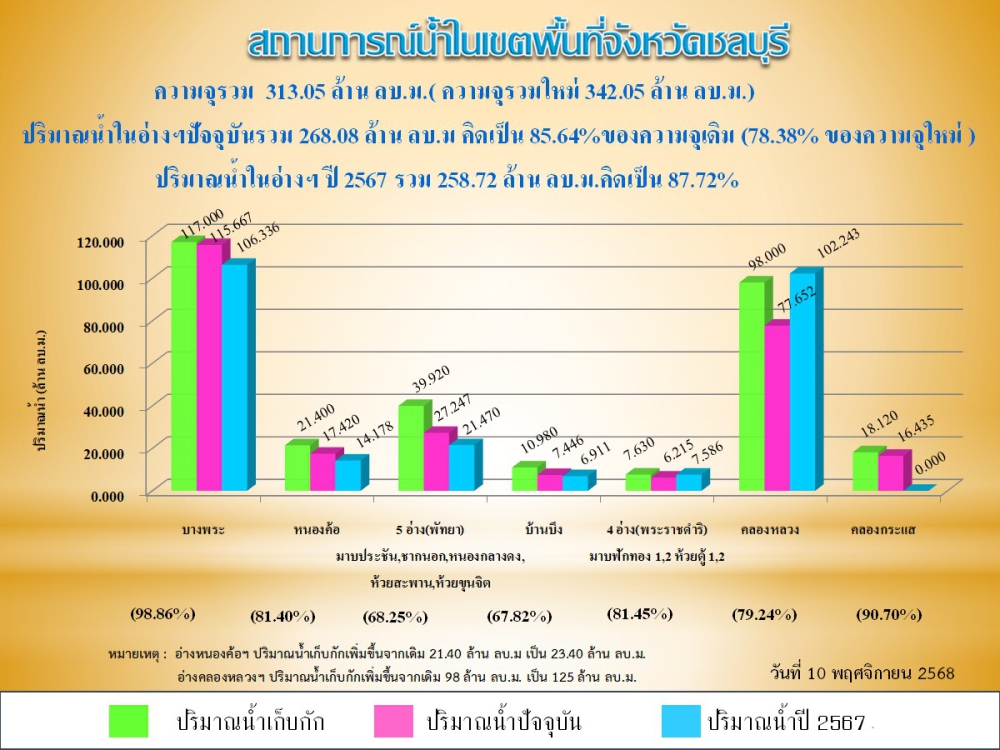 รายงานสถานการณ์น้ำอ่างเก็บน้ำจังหวัดชลบุรี ประจำวันที่ 10 พฤศจิกายน 2568