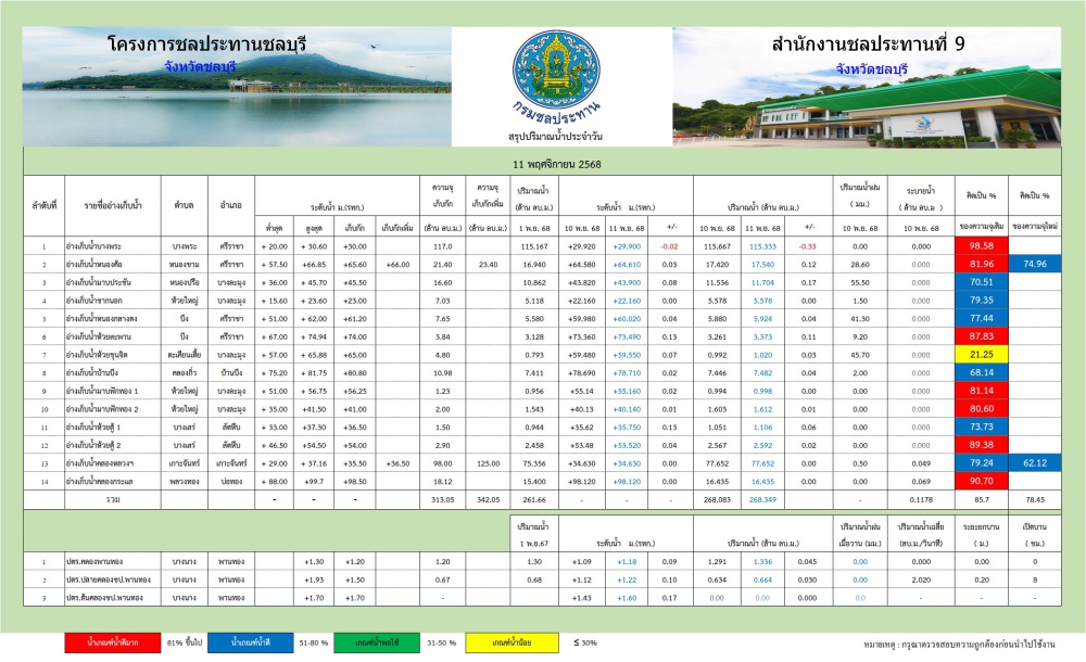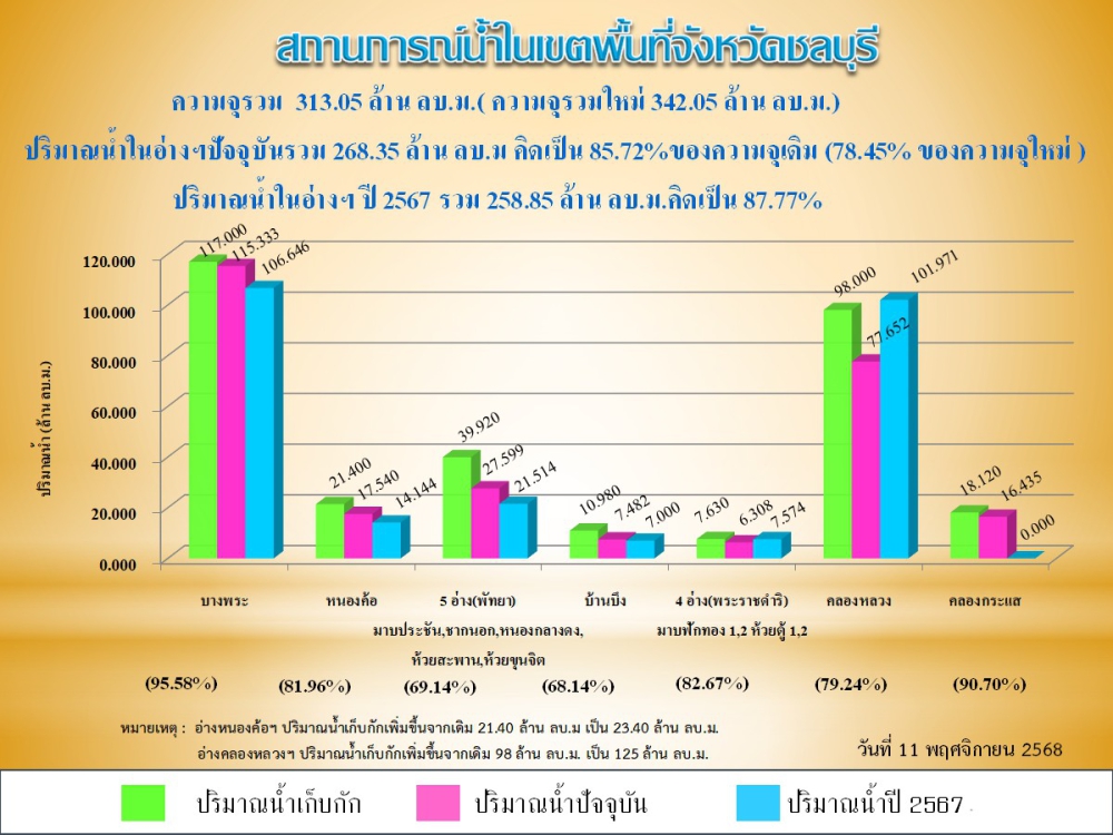 รายงานสถานการณ์น้ำอ่างเก็บน้ำจังหวัดชลบุรี ประจำวันที่ 11 พฤศจิกายน 2568