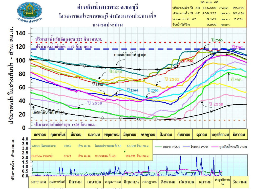 รายงานสถานการณ์น้ำอ่างเก็บน้ำจังหวัดชลบุรี ประจำวันที่ 18 พฤศจิกายน 2568