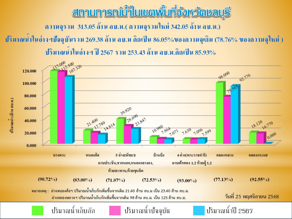 รายงานสถานการณ์น้ำอ่างเก็บน้ำจังหวัดชลบุรี ประจำวันที่ 25 พฤศจิกายน 2568