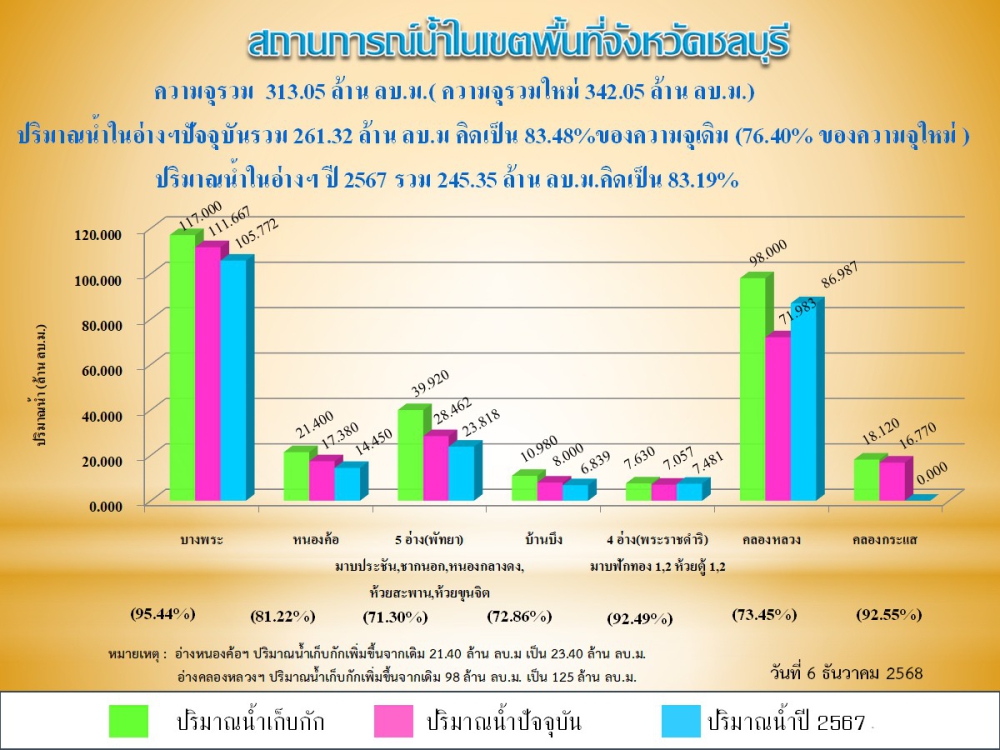 รายงานสถานการณ์น้ำอ่างเก็บน้ำจังหวัดชลบุรี ประจำวันที่ 6 ธันวาคม 2568