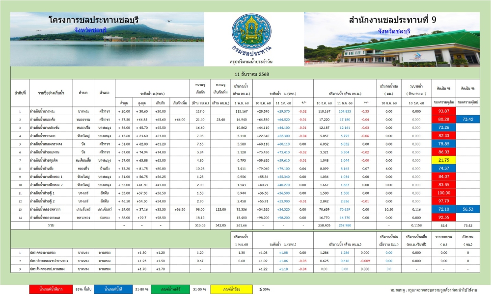 รายงานสถานการณ์น้ำอ่างเก็บน้ำจังหวัดชลบุรี ประจำวันที่ 11 ธันวาคม 2568