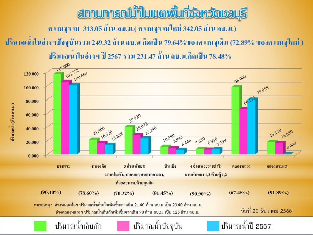 รายงานสถานการณ์น้ำอ่างเก็บน้ำจังหวัดชลบุรี ประจำวันที่ 20 ธันวาคม 2568