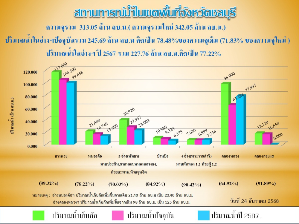 รายงานสถานการณ์น้ำอ่างเก็บน้ำจังหวัดชลบุรี ประจำวันที่ 24 ธันวาคม 2568