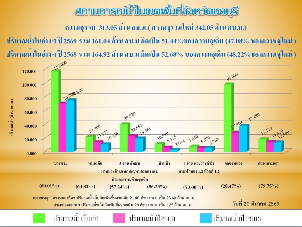 รายงานสถานการณ์น้ำอ่างเก็บน้ำจังหวัดชลบุรี ประจำวันที่ 20 มีนาคม 2569