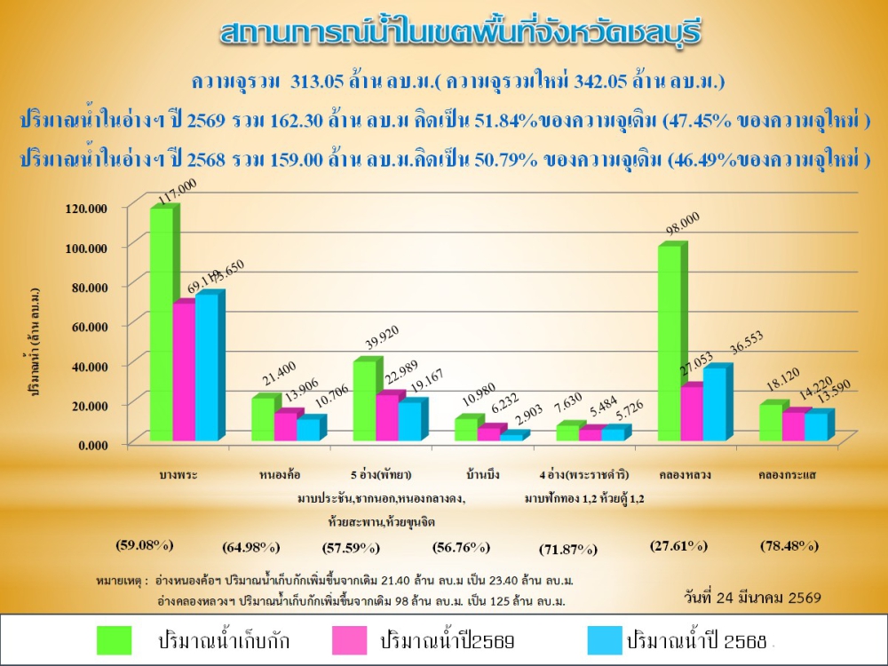 รายงานสถานการณ์น้ำอ่างเก็บน้ำจังหวัดชลบุรี ประจำวันที่ 24 มีนาคม 2569