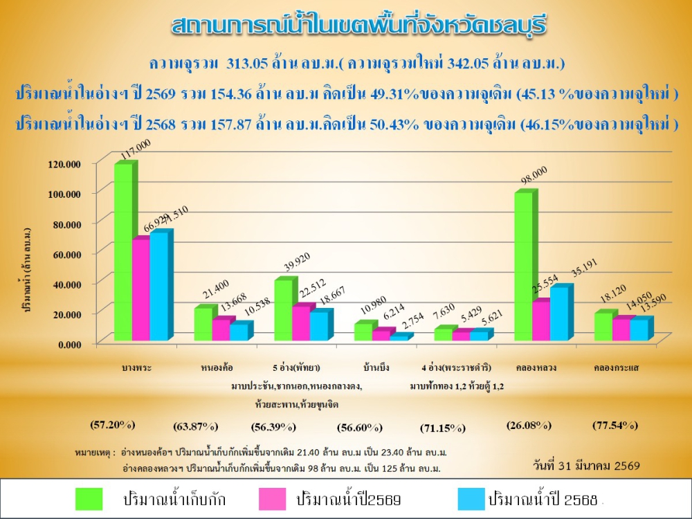 รายงานสถานการณ์น้ำอ่างเก็บน้ำจังหวัดชลบุรี ประจำวันที่ 31 มีนาคม 2569