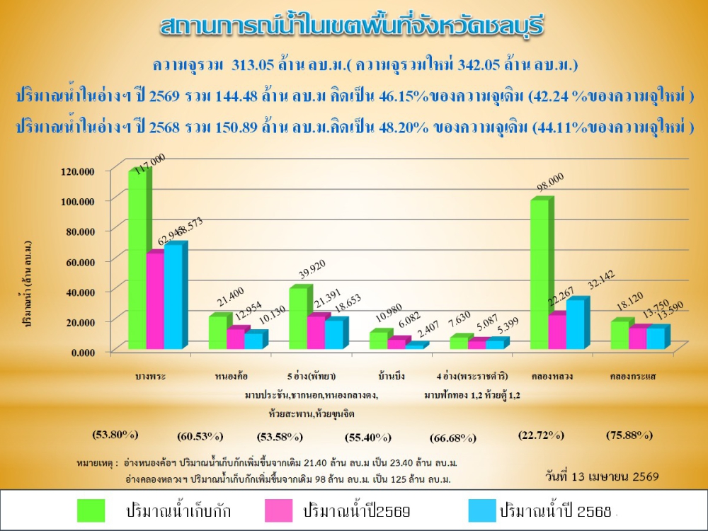 รายงานสถานการณ์น้ำอ่างเก็บน้ำจังหวัดชลบุรี ประจำวันที่ 13 เมษายน 2569