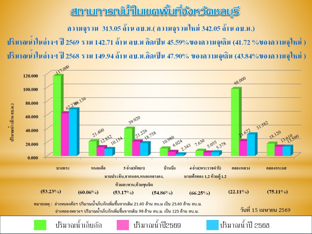รายงานสถานการณ์น้ำอ่างเก็บน้ำจังหวัดชลบุรี ประจำวันที่ 15 เมษายน 2569