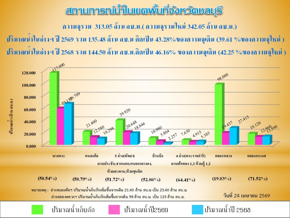 รายงานสถานการณ์น้ำอ่างเก็บน้ำจังหวัดชลบุรี ประจำวันที่ 24 เมษายน 2569