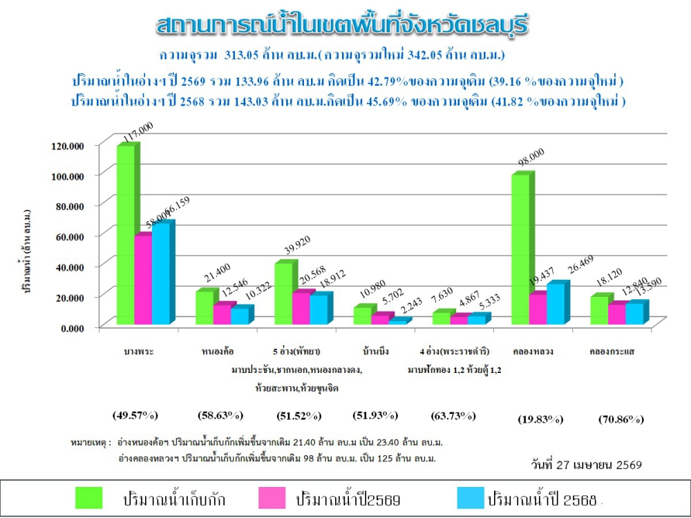 รายงานสถานการณ์น้ำอ่างเก็บน้ำจังหวัดชลบุรี ประจำวันที่ 27 เมษายน 2569