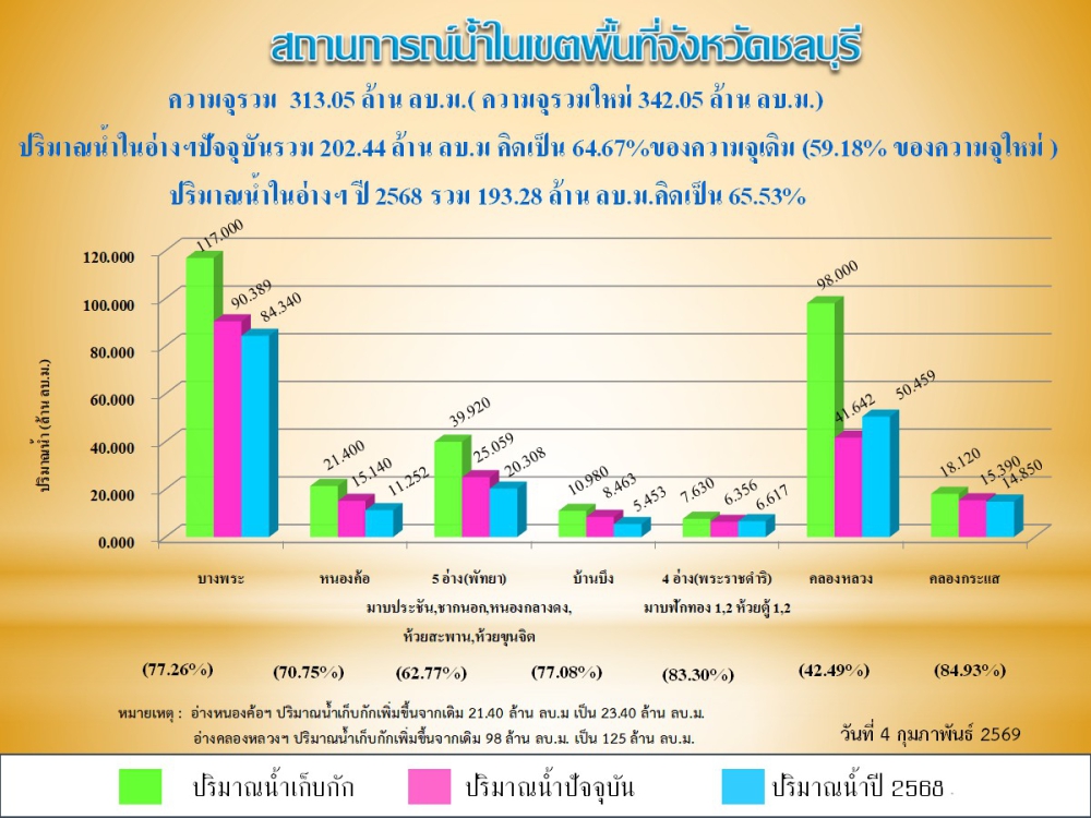 รายงานสถานการณ์น้ำอ่างเก็บน้ำจังหวัดชลบุรี ประจำวันที่ 4 กุมภาพันธ์ 2569