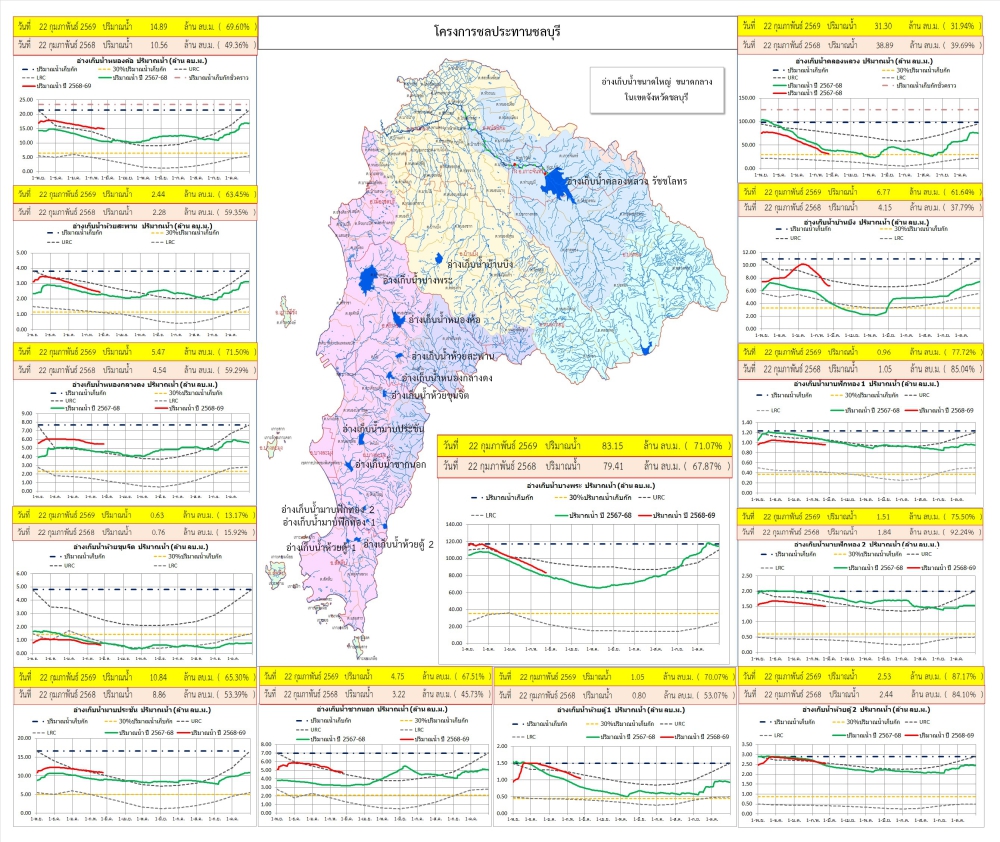 รายงานสถานการณ์น้ำอ่างเก็บน้ำจังหวัดชลบุรี ประจำวันที่ 22 กุมภาพันธ์ 2569