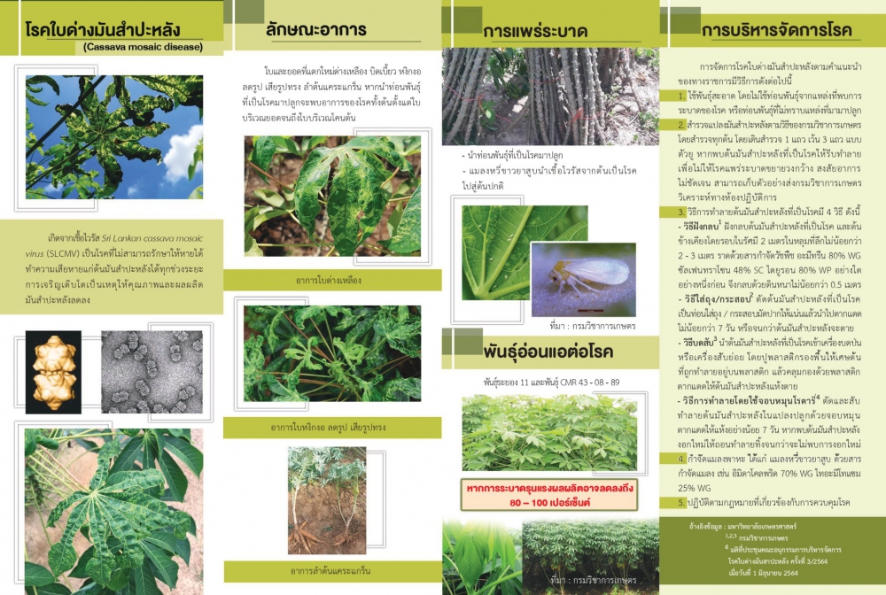 โรคใบด่างมันสำปะหลัง เกิดจากเชื้อไวรัส Sri Lankan cassava mosaic virus (SLCMV) เป็นโรคที่ไม่สามารถรักษาให้หายได้ ทำความเสียหายแก่ต้นมันสำปะหลังได้ทุกช่วงระยะการเจริญเติบโตเป็นเหตุให้คุณภาพและผลผลิตมันสำปะหลังลดลง