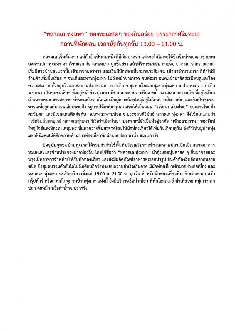 "หลาดเล ทุ่งมหา” ของทะเลสดๆ ของกินอร่อย บรรยากาศริมทะเล สถานที่พักผ่อน เวลานัดกันทุกวัน 13.00 – 21.00 น.
