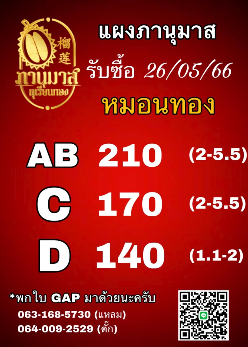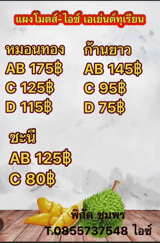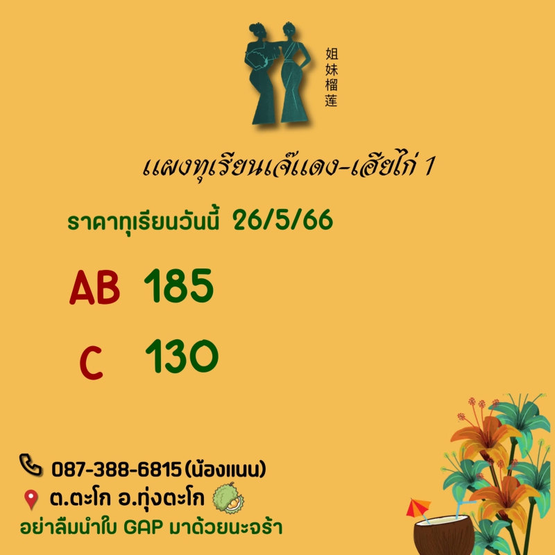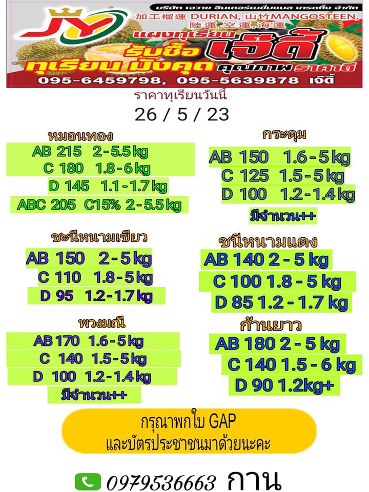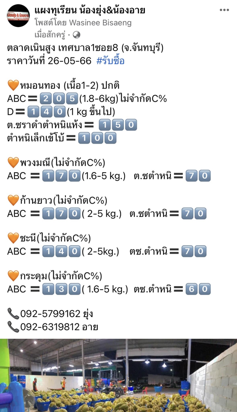ราคารับซื้อทุเรียน วันที่ 26 พฤษภาคม 2566