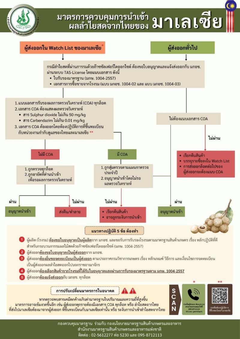 เตือนผู้ส่งออกลำไย มาเลเซียประกาศยกระดับมาตรการควบคุมการนำเข้าผลลำไยสดจากไทย กำหนดให้ผู้ส่งออกที่อยู่ในรายชื่อเฝ้าระวังต้องแนบผลตรวจสารตกค้างประกอบการนำเข้า เริ่มตั้งแต่วันที่ 1 เมษายน 2567 เป็นต้นไป เตือนผู้ส่งออกไทยเพิ่มความระมัดระวัง ส่งออกลำไยที่มีคุณภาพและได้มาตรฐานเท่านั้น ป้องกันการระงับนำเข้าในอนาคต