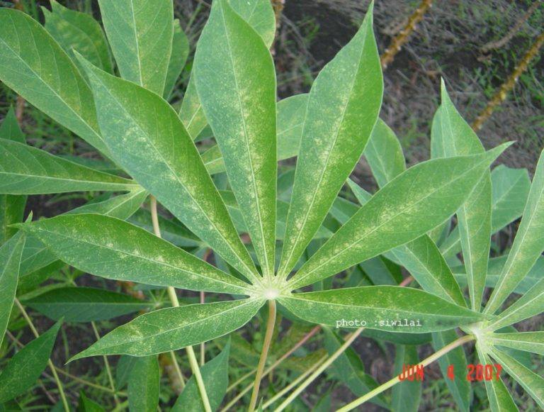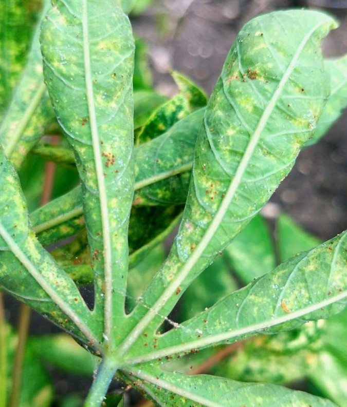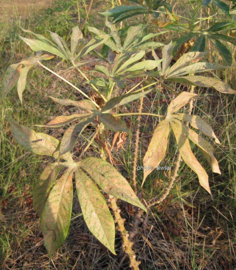 2. หมั่นตรวจแปลงในช่วงสภาพอากาศแห้งแล้ง ถ้าพบการระบาดของไรแดงให้เก็บใบมันสำปะหลังมาทำลาย
