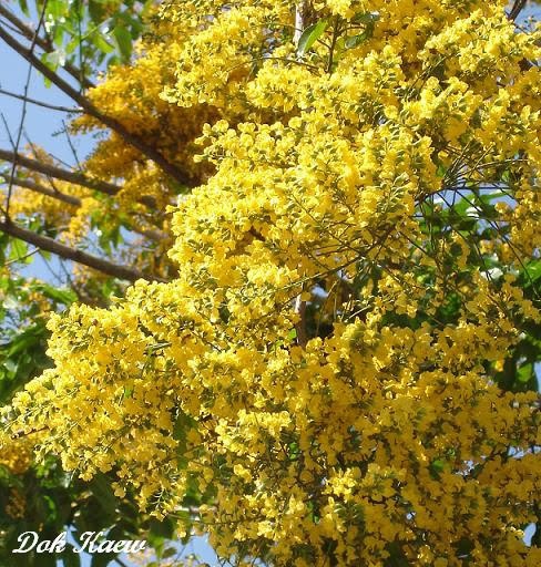 ดอก เป็นช่อแบบช่อกระจะ โดยจะออกบริเวณซอกใบหรือที่ปลายกิ่ง โคนก้านมีใบประดับ 1-2 อัน ลักษณะเป็นรูปรี กลีบเลี้ยงดอกมี 5 กลีบ ติดกันเป็นถ้วยสีเขียว ปลายแยกเป็นแฉก 2 แฉก แบ่งเป็นอันบน 2 กลีบติดกัน และอันล่าง 3 กลีบติดกัน ส่วนกลีบดอกมี 5 กลีบ สีเหลืองแกมแสด ลักษณะของกลีบเป็นรูปผีเสื้อ ดอกมีเกสรเพศผู้ 10 อัน ก้านชูอับเรณูติกันเป็น 2-3 กลุ่ม ส่วนเกสรเพศเมียมี 1 อัน ดอกมีกลิ่นหอมแรง ดอกจะบานและร่วงพร้อมกันทั้งต้น